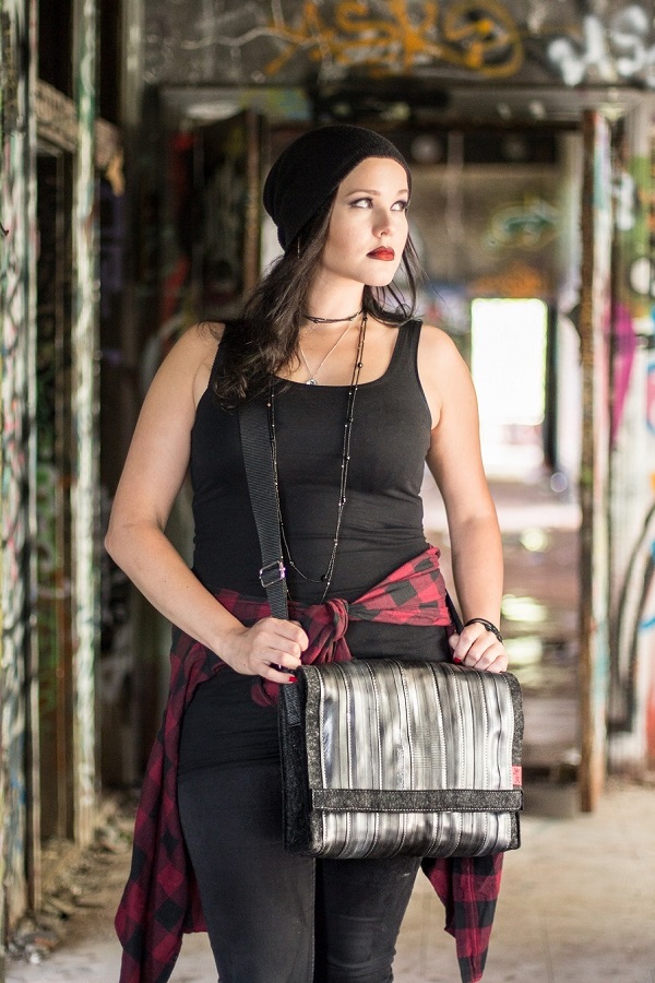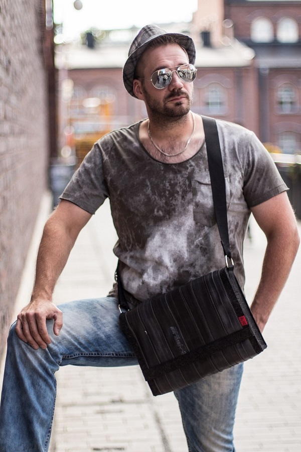 Laukku on tehty polkupyörän renkaan sisäkumista ja laadukkaasta nahasta. Lisäksi laukussa on käytetty antrasiitinharmaata villahuopaa. Säädettävä olkahihna on kestävä ja 40mm leveä. Läppä magneettikiinnityksellä. Erittäin kestävä ja ympäristöystävällinen valinta.